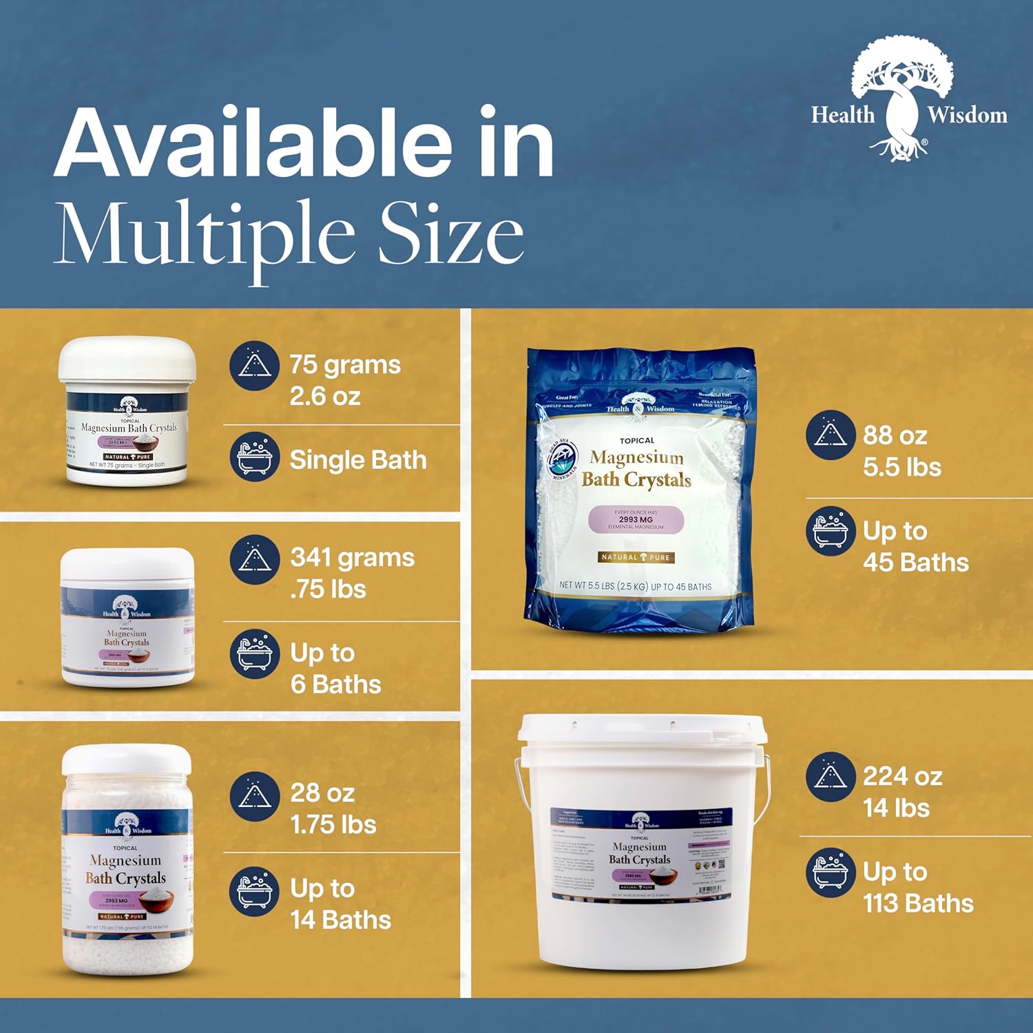 Health and Wisdom Magnesium Bath Crystals - Bath Salts with High Concentration & Enhanced Absorption for Muscle & Joint Relief - Dead Sea Sourced - Unscented - 1.75 lbs - Up to 14 Uses