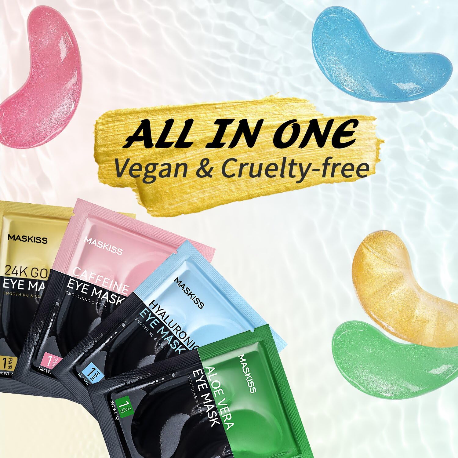 - Comprehensive Eye Care Treatment: The Maskiss set includes 4 colors, 50 pairs of under-eye patches. 24k Gold eye mask helps to smooth the skin, reduce fine lines and wrinkles. Caffeine eye patches help promotes eye metabolism and circulation, and reduces eye bags and puffy eyes. Hyaluronic acid eye masks help to fade dry lines and wrinkles, and locks in moisture and nutrition. Aloe vera eye patch helps to reduce pigmentation, repair the healing barrier, and gently moisturize the skin. Add these to your daily self-care routine for a visibly younger, well-rested appearance.
