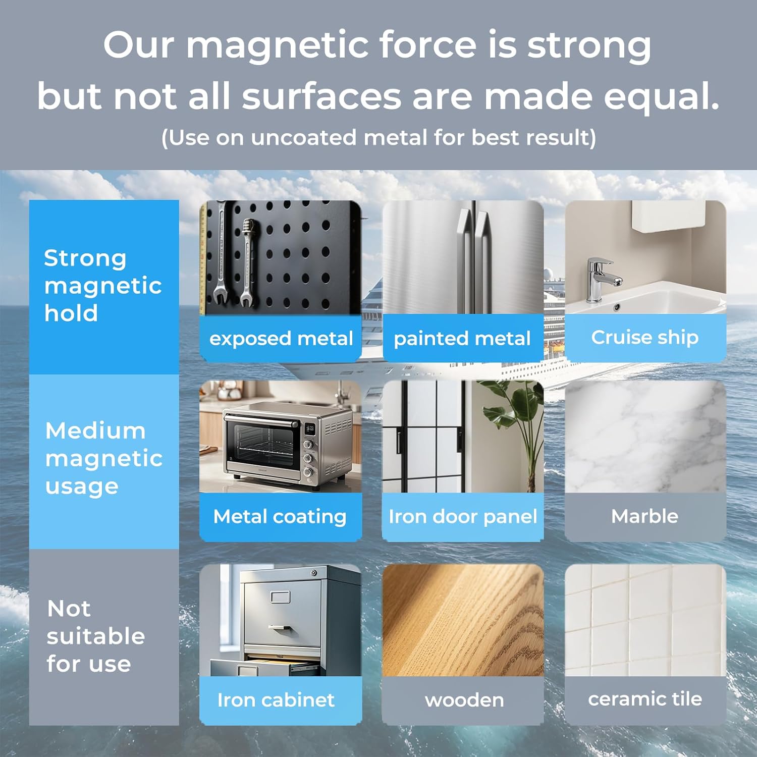 - Strong Magnetic Mount – Check Surface Compatibility : Equipped with powerful built-in magnets for wall or cabinet door attachment - no tools needed. Note: Magnetic strength depends on surface material – smooth metal works best; painted or thick plastic walls may reduce hold.