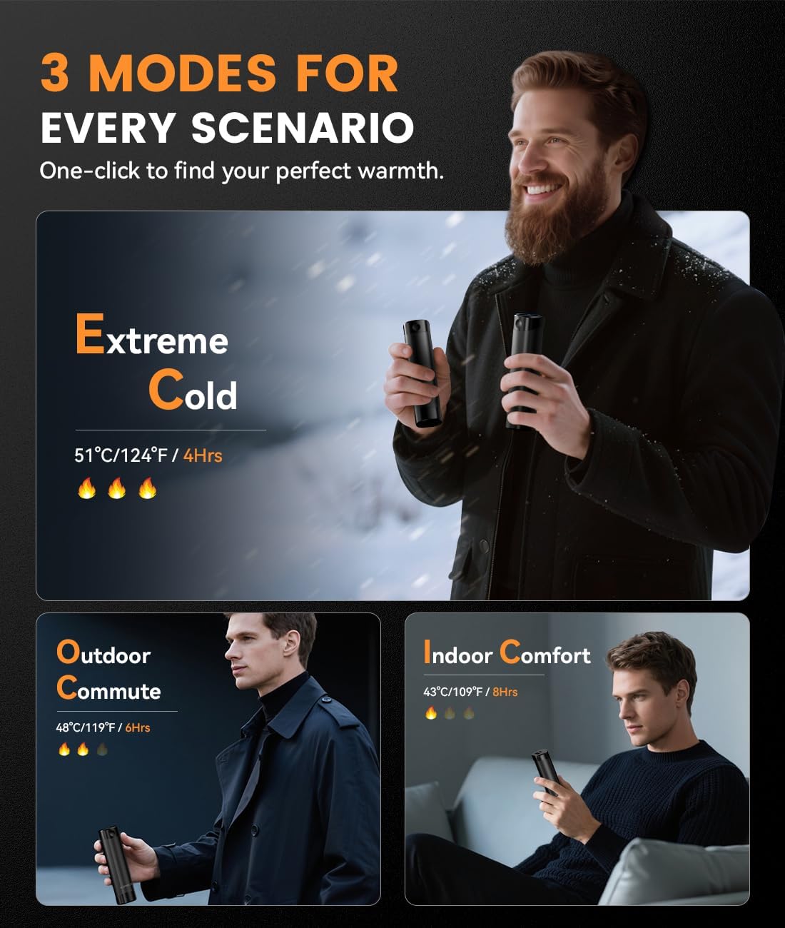 - 3 MODES & POWER, YOUR PERFECT COMPANION - Tailor your comfort. Choose from Low(109°F), Medium(119°F), and High(124°F) settings for everything from indoor work to outdoor sports. Plus, its built-in 5000mAh battery doubles as an emergency power bank.